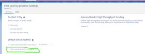 Now when you are trying to send email with a target DE where subscriberkey is 12345 but email address is changed to vikram.singh@abc.com then from the journey settings we can define the email address to be selected either from all contacts or from the target DE.